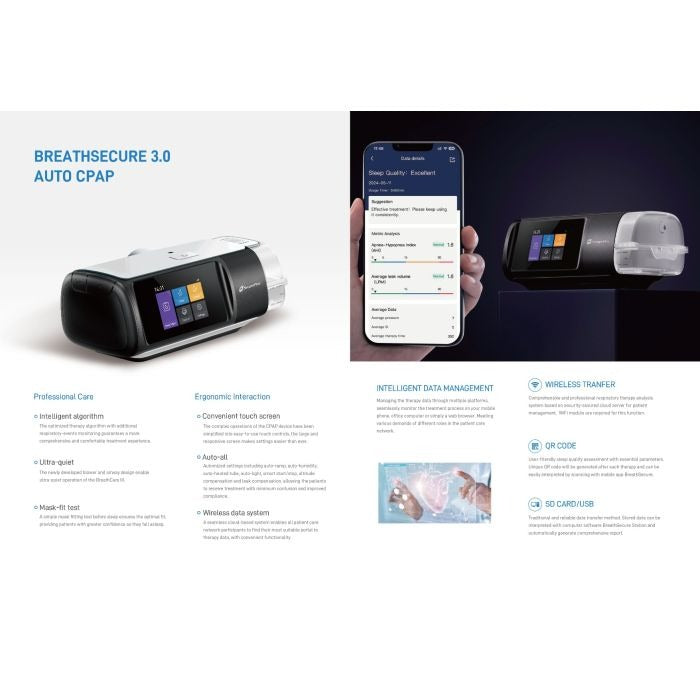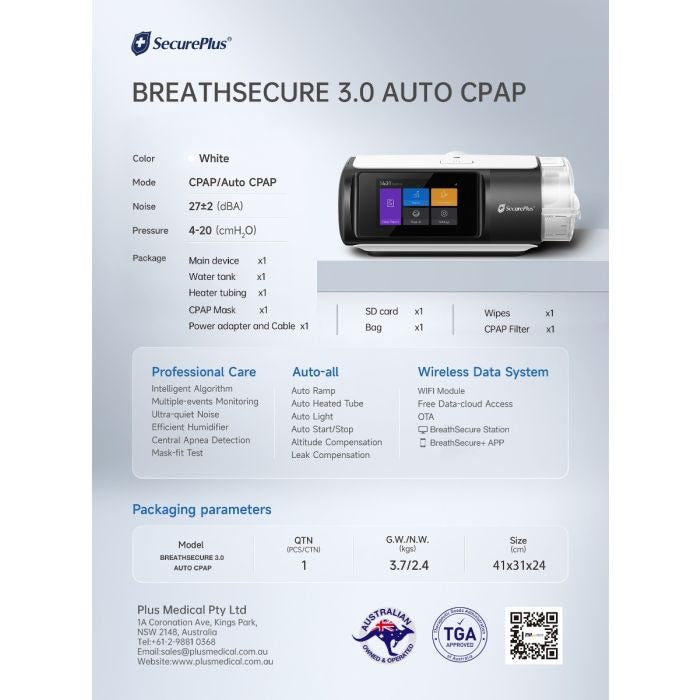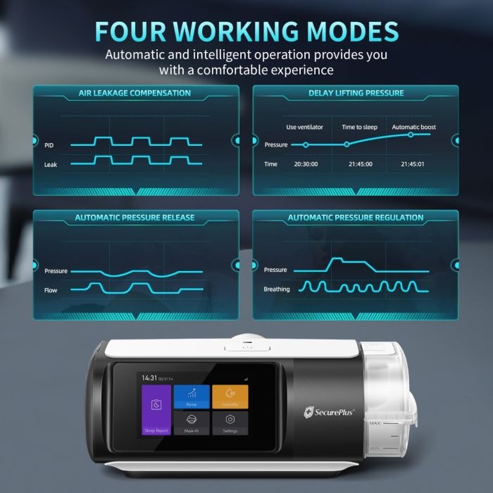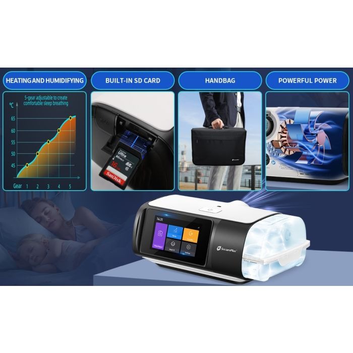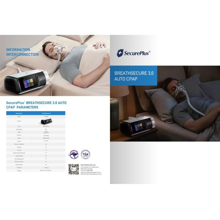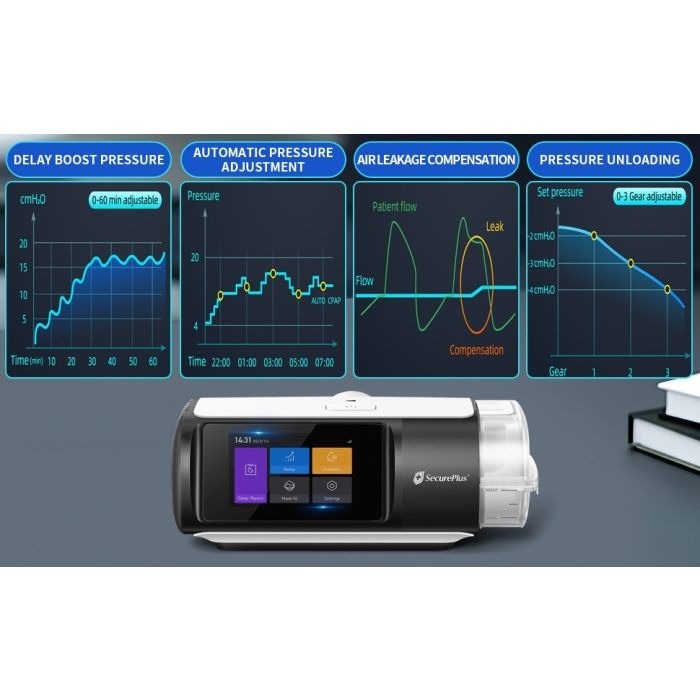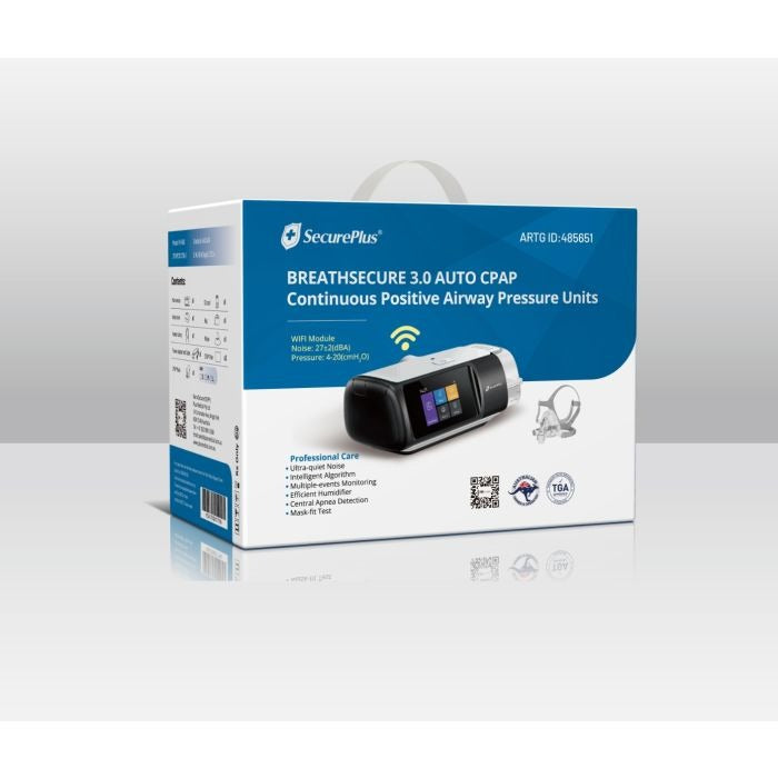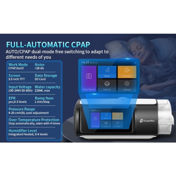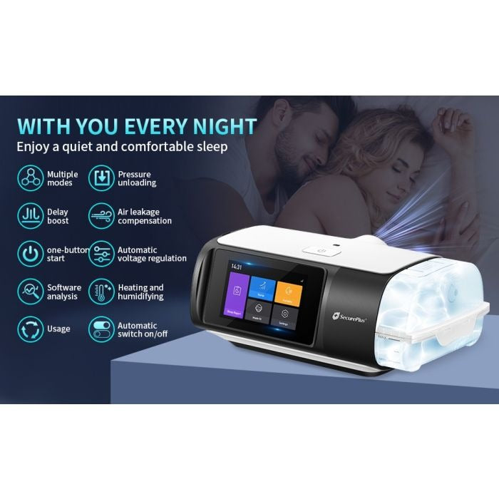 Compatible with most CPAP masks, this compact machine features a bright 3.5” TFT display and a simplified interface that makes setup and nightly use effortless. Whether you’re a first-time CPAP user or upgrading from an older model, Secure Plus CPAP 3.0 gives you the tools to reclaim restful sleep with confidence.
