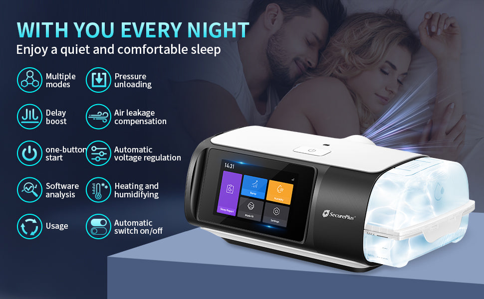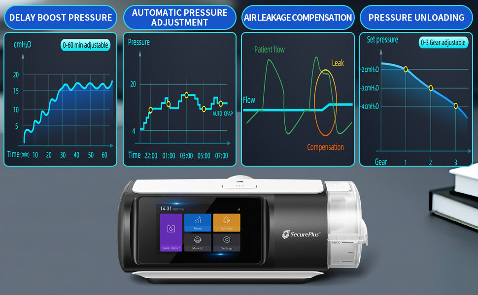 Compatible with most CPAP masks, this compact machine features a bright 3.5” TFT display and a simplified interface that makes setup and nightly use effortless. Whether you’re a first-time CPAP user or upgrading from an older model, Secure Plus CPAP 3.0 gives you the tools to reclaim restful sleep with confidence.