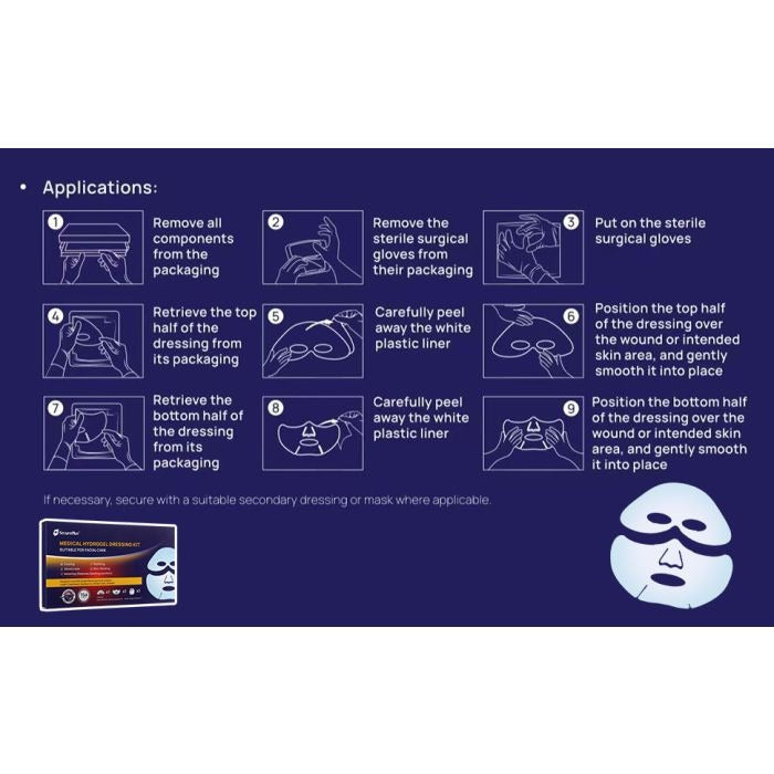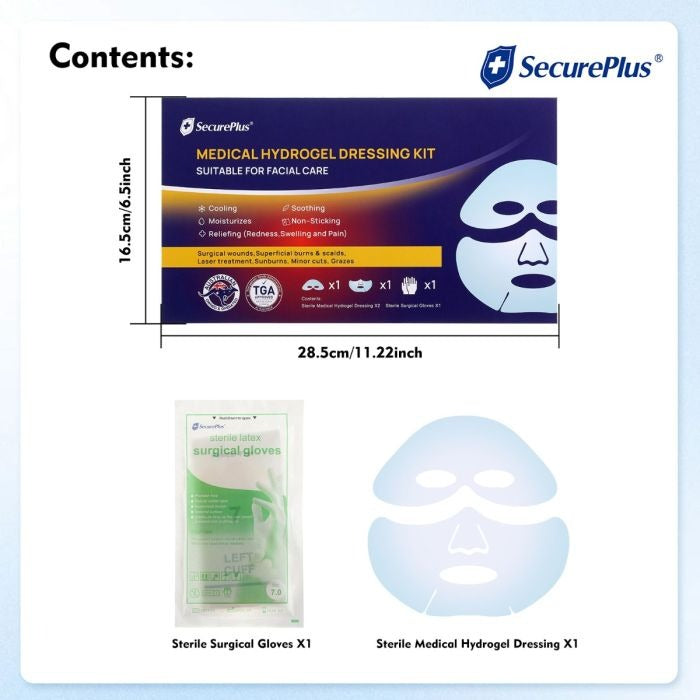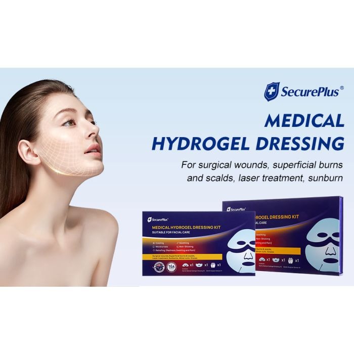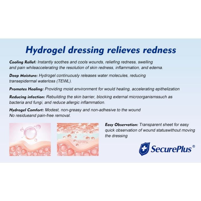 The Secure Plus Medical Hydrogel Dressing Kit is designed for use in clinical or personal care environments. Each kit includes two sterile hydrogel dressings and one pair of sterile surgical gloves.